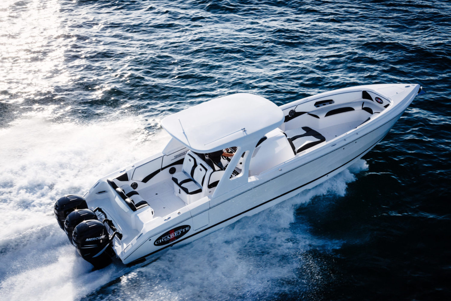 With an attractive exterior, it is in action that the Cigarette makes the most difference. Like all boats of the brand, the 39′ GTS uses a hull profile that is particularly well designed. Rather narrow for the length of the boat, the hull has a very sharp V with two oversized strakes and a very pronounced bilge. Then come two very deep steps directly inherited from the brand’s offshore racing hulls. The flatter rear part ensures stability and an optimal water flow to the propeller. The engines are installed on a bracket to improve behavior and performance of the boat. Everything here has been thought of for performance and efficiency and the tall sides and the high bow ensure the safety of the crew and keep everyone dry.