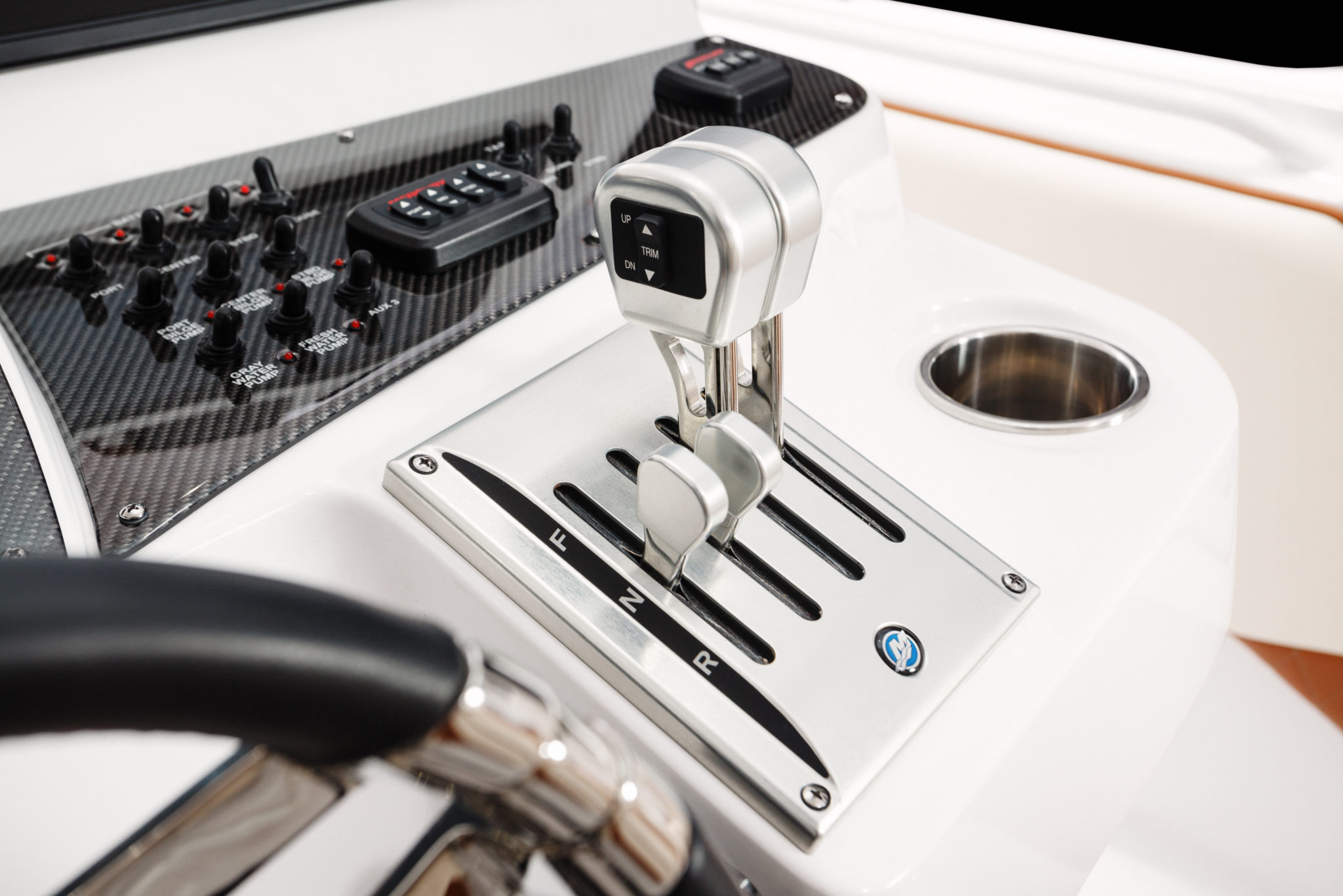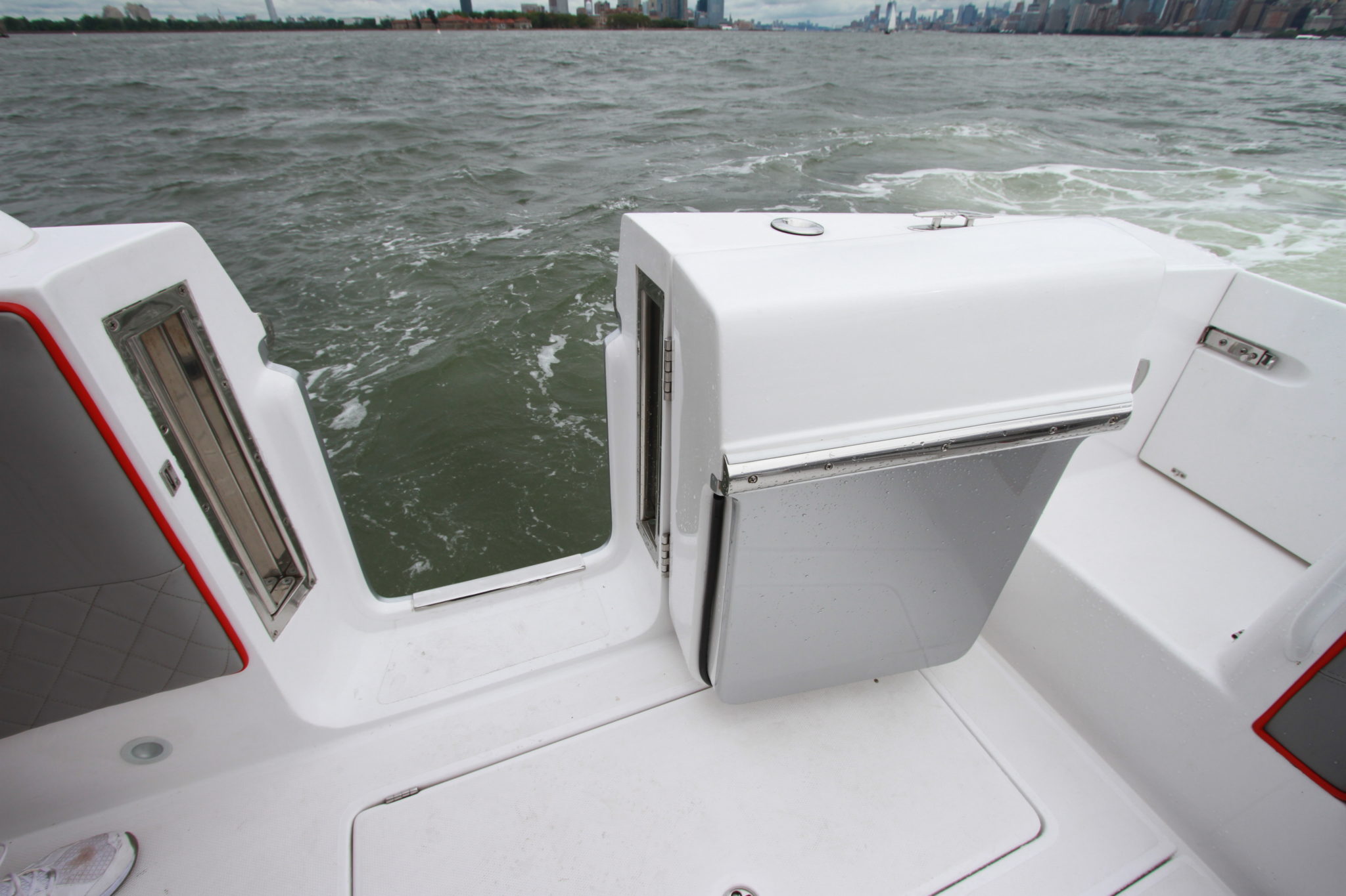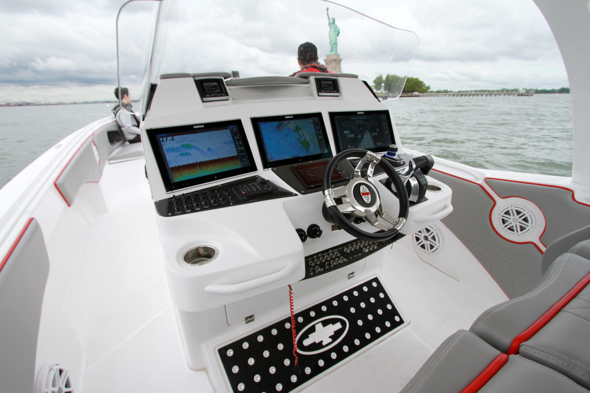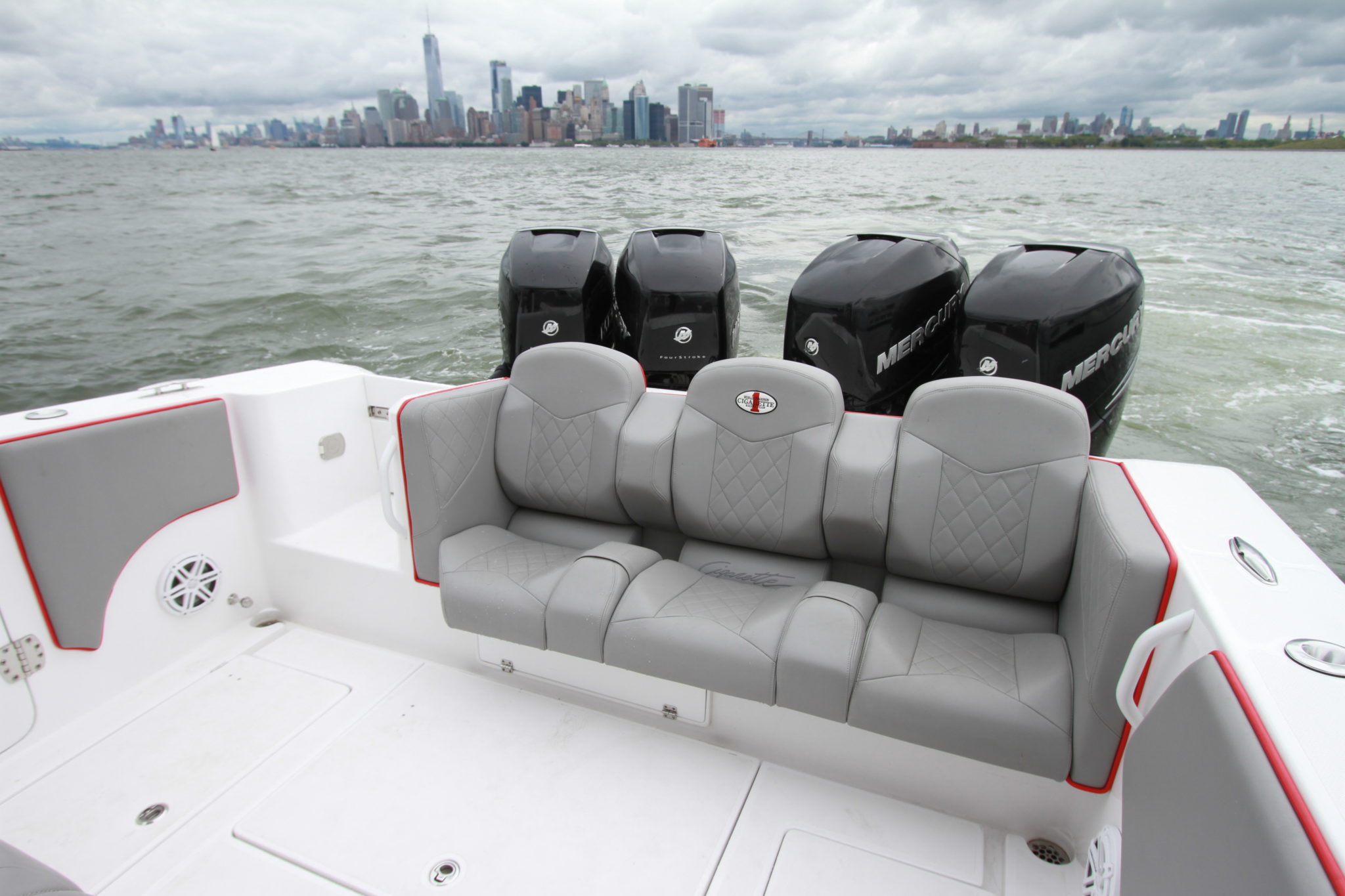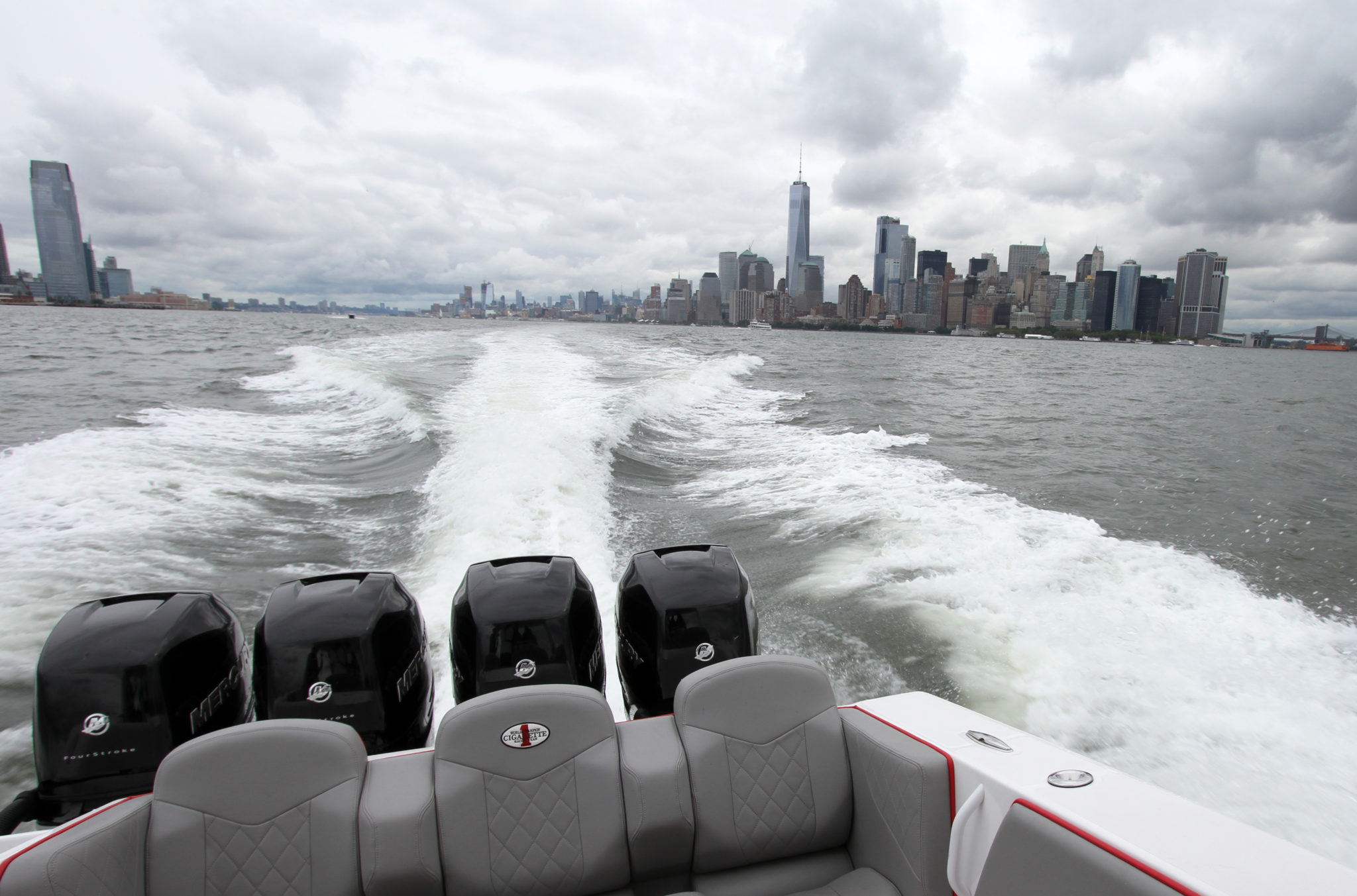 Once the controller is in hand, you don’t need to wait for a long time before the magic operates, especially with our configuration of the day, 4 x 350 hp Mercury Verado. These 1400 HP are just waiting for the start signal. Well balanced, the boat sails quickly without rearing outrageously, allowing for full visibility during the acceleration phase. Then, everything happens very quickly. After fully planing, we are already well above 23 mph and the speedometer needle climbs without fail. At 4000 rpm, we are already at more than 50 mph which makes it possible to obtain a cruising speed at 4500 rpm, around 55 mph. The rest is just literature, since at 5000 rpm we reach 63 mph and the game ends that day with 78 mph on the GPS, the weather and traffic on the Hudson River limiting our ardor while the boat clearly has the ability to spin beyond 80 mph. The most important thing is not the speed, but rather the ease with which the boat sails, providing total comfort to the passengers. Even more surprising is that our boat was equipped with the Active Trim, the Mercury system which offers an automatic and autonomous adjustment of the trim. While we thought this accessory was reserved for small units, it is wonderful here even if it only works for speeds above 25 mph. Another good surprise is the curve behavior, often a weak point for step hulls, but here, it is clear that the curves come easily one after another and that the radius of gyration is even quite tight, offering this boat a little more versatility.