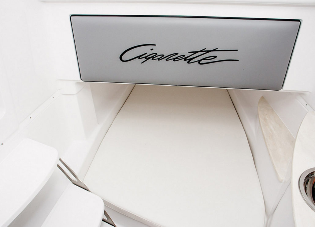 The central space is reserved for the driving area, and in this domain, Cigarette is a master. The crew can take advantage of the three adjustable seats with a folding part. Each of them has an individual and foldable footrest and the driving position is just perfect. In the center, the pilot has all the controls on hand. If you are audacious, you can even play it in a racing way with a throttleman who deals with the throttle and trim while you’re driving. The console also incorporates three large screens, the Mercury vessel view and buttons used to configure the entire boat, the engine settings, the cabin lighting, the lift or the courtesy lights. Other good points again are the handrails, solid and well located; the windshield, very effective and the anti-slip foot plate which also evokes the offshore world.