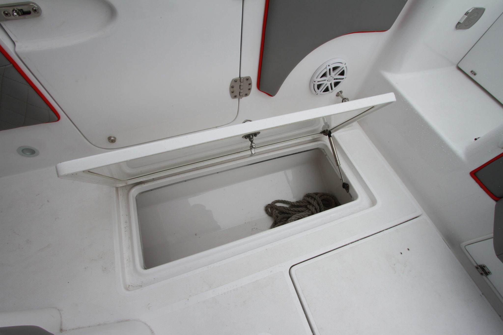 Therefore, if we are able to find the characteristic racy line, the boat offers, in addition, a nice hardtop that provides valuable protection against the sun or rain. The cockpit is organized around three distinct spaces. The front space has seats and a double “lounge” seat in front of the console. If necessary, you can install a table in the middle (optional) for a glass of champagne at the marina or for a picnic in a deserted cove. Obviously, the seats hide a few storage compartments and there is also a floor box. Some good points are the side upholstery, the omnipresent handrails and the perfect integration of speakers.