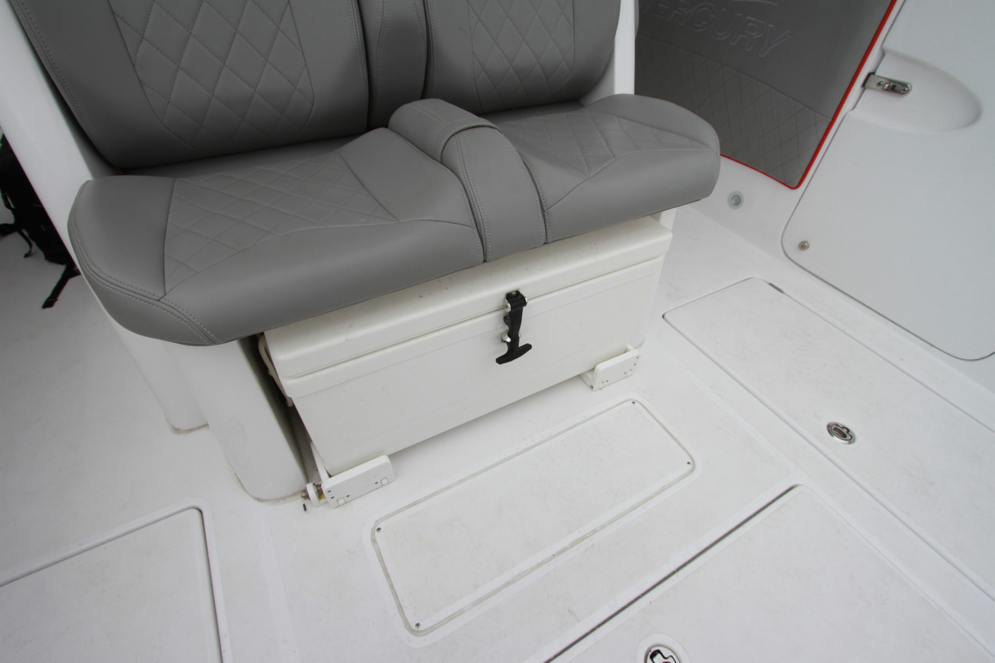 On the back, the cockpit itself occupies a significant area allowing for a little bit of fishing. Attached to the transom, a bench made of three semi-bucket seats ensures comfort and support during the fast runs. In addition, the starboard side has a door for easy access to the bathing platform. This platform is large enough to receive up to four engines even if the boat is offered with two or three engines. Our configuration of the day was with 4 x 350 HP Verado. Facing the rear bench, two other seats positioned on the back of the leaning post allow for more conviviality as far as just below, there is a large cooler. It’s a pity that these seats are a little high for normal size people. The floor has three boxes and two of them can be used as fish tanks. Finally, the 39′ GTS gives way to the trend by offering a very practical side door.