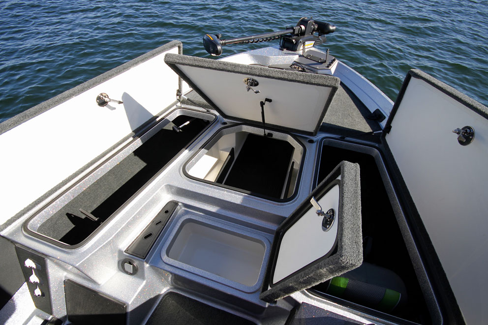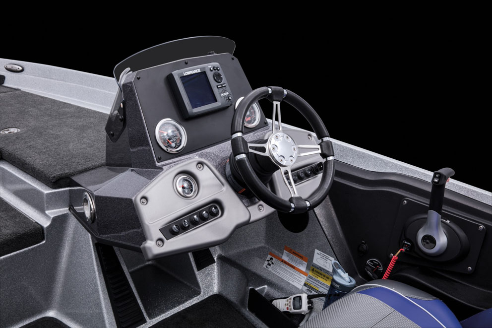 With 115 hp, the Ranger reaches 43 mph. It’s enough to get to a good fishing spot. Another good thing about this boat is the driving position. Well installed in the comfortable chair, the pilot can enjoy a hot foot throttle (optional) which is very useful. The small windshield is efficient and the dashboard is really complete with the switches on the bottom, the gauges in the middle and enough room for a seven-inch fish finder or GPS (another one can be installed on the front too).