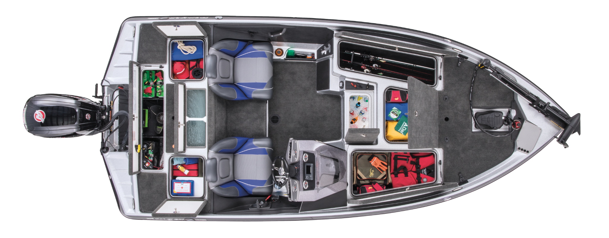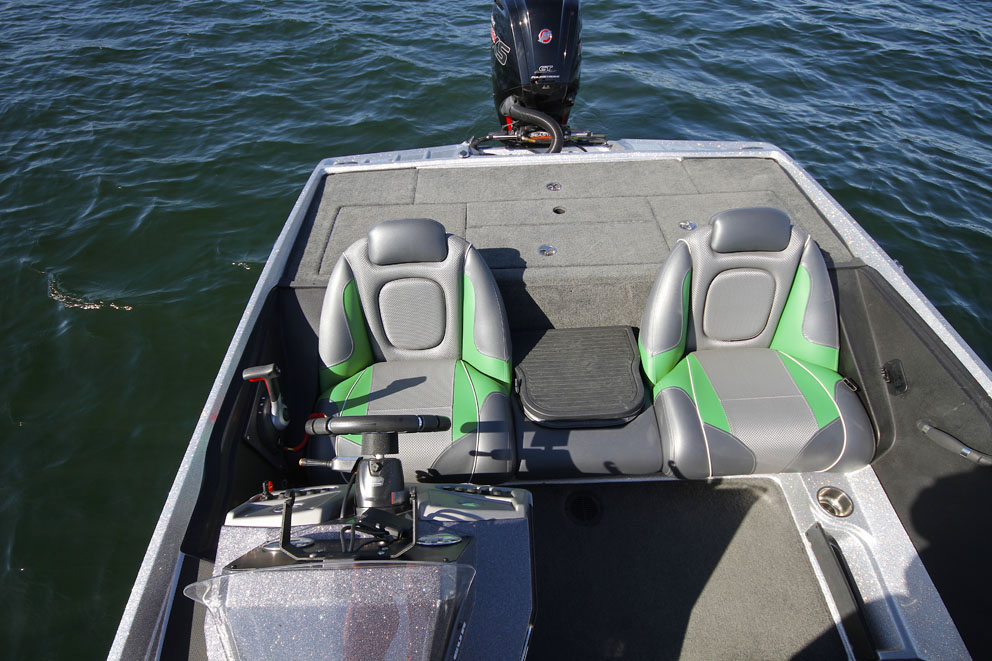 The electric engine is installed at the front, on the large platform (5 ft. 24 in. by 4 ft. 92 in.). It can be maneuvered with the foot pedal to manage speed and direction. You can also use  a remote which allows you to maneuver from any place on board. With one or two people in the front, the Ranger Z 175 is still stable and allows people to move around easily on board. At the rear, the cockpit is deep enough (24 in.), but mainly occupied by the console on starboard. In this place there are also two really comfortable armchairs and a small central seat above the fuel tank, whose backrest can be folded to facilitate the access to the rear platform. This platform is really large (88 in. x 35 in.) compared to the size of the boat so it’s easy to stand up, offering a perfect place for a fisherman. Under the platform, there are two fish boxes, a livewell and, a technical chest with the batteries. Finally, you can install a standard fold down seat post on the front and on the rear.