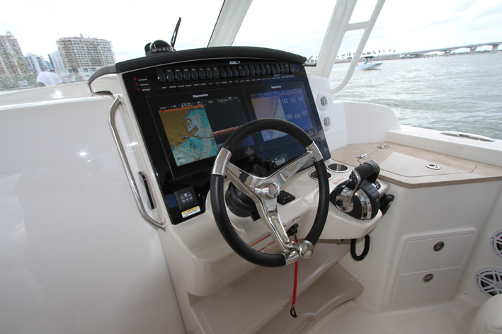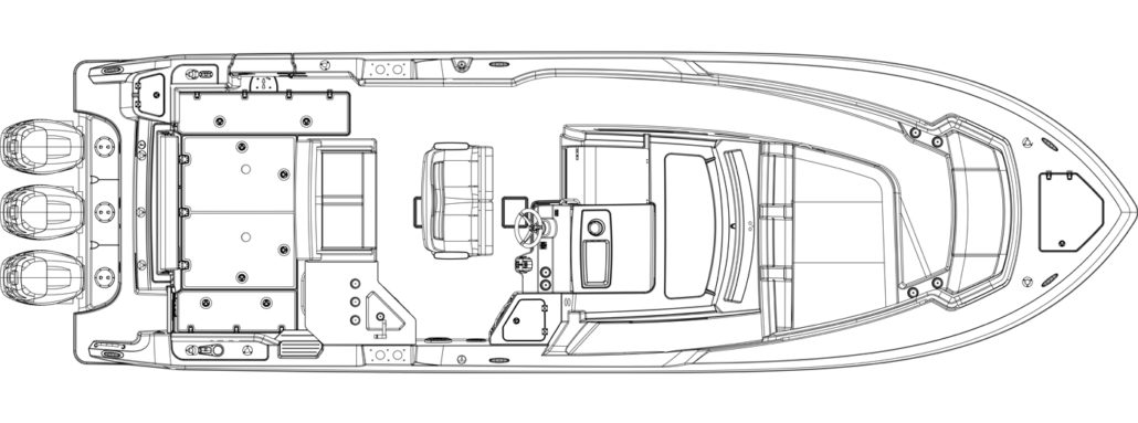 In the center of the boat, shifted to starboard, the cockpit is once again a model of its kind with good ergonomics (for example, the two-leveled footrest), and a suitable location for each element. You can install two large electronic screens, which will not interfere with access to the switches, located just below the cap. The throttle is also really accessible and the joystick is ideally placed on the right. The whole is protected behind a wide windshield and kept under the hardtop. The last detail is a cooler, housed on the side and therefore easily accessible.