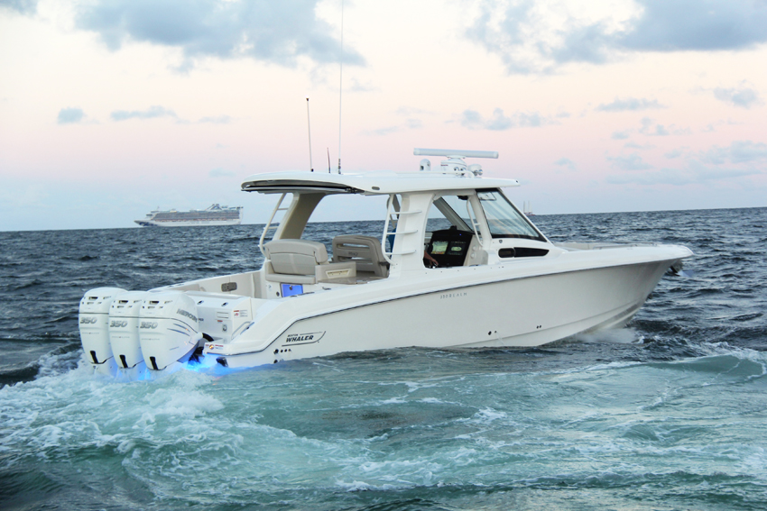Anyone who still thinks that Boston Whaler only produces fishing boats will have to change his mind forever. After the Vantage series, which is already very much geared toward day-to-day family entertainment, the Realm range takes the Florida shipyard to a whole new level. Indeed, the Realm 350 is a true crossover, a mix between an Outrage and a Conquest with a pinch of the Vantage.