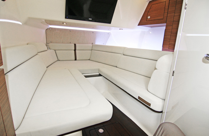 Finally, continuing its path, we arrive at a comfortable front lounge consisting of a double seat “lounge” with armrests and cup holders. Another double seat on the bow faces it and a table completes the whole. We can, of course, turn everything into a comfortable solarium for two or three people and as a bonus the seats conceal storage.