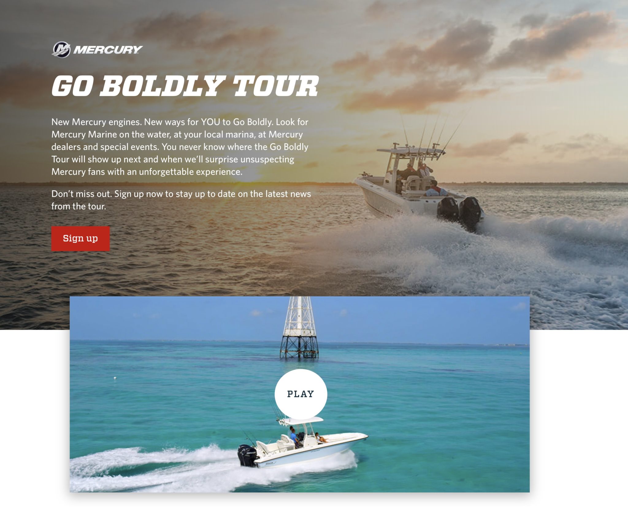 According to Dauchy, Mercury will handpick boating and fishing enthusiasts who will receive an opportunity to participate in a unique experience as part of the Go Boldly Tour. Mercury will select these individuals based on their interactions with Mercury via social media, at Mercury exhibits and on test‑ride boats demonstrating the performance of Mercury outboard engines. Throughout the year, Mercury’s test rides at boat shows and other events will include a variety of boats equipped with engines representing Mercury’s brand‑new lineup of 3.4‑liter V‑6 outboards, which combine quick acceleration, light weight, and fuel economy.