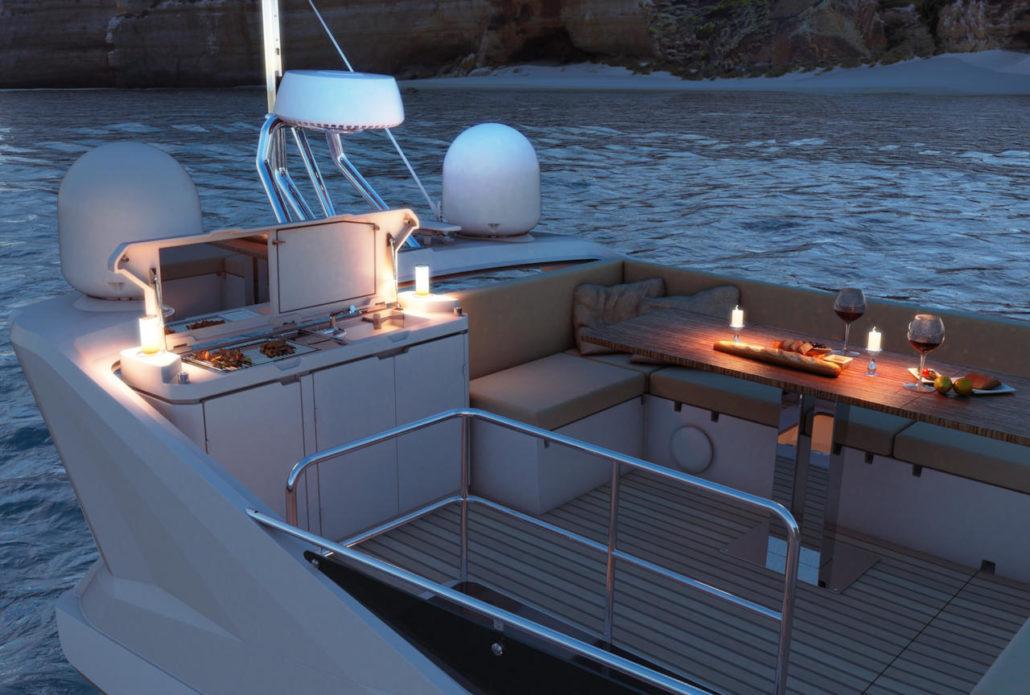 The Flybridge offers 150 square feet with a dining area for 6 people and an all-in-one Gourmet Wetbar with BBQ, washbasin and lighting.